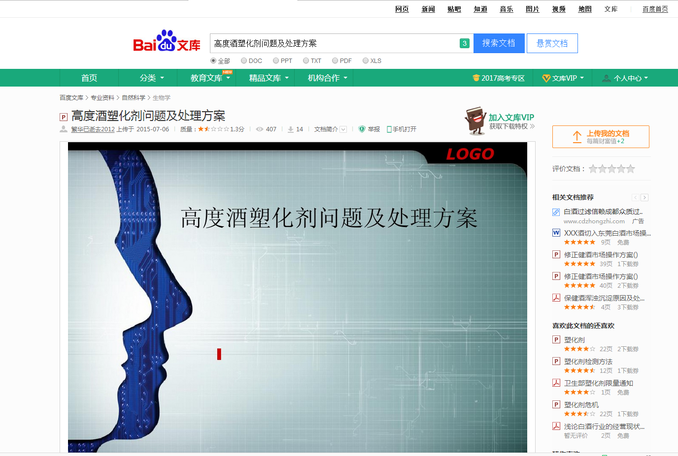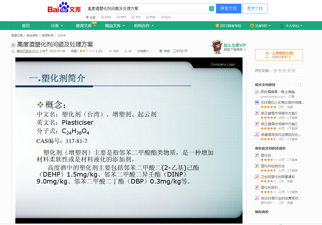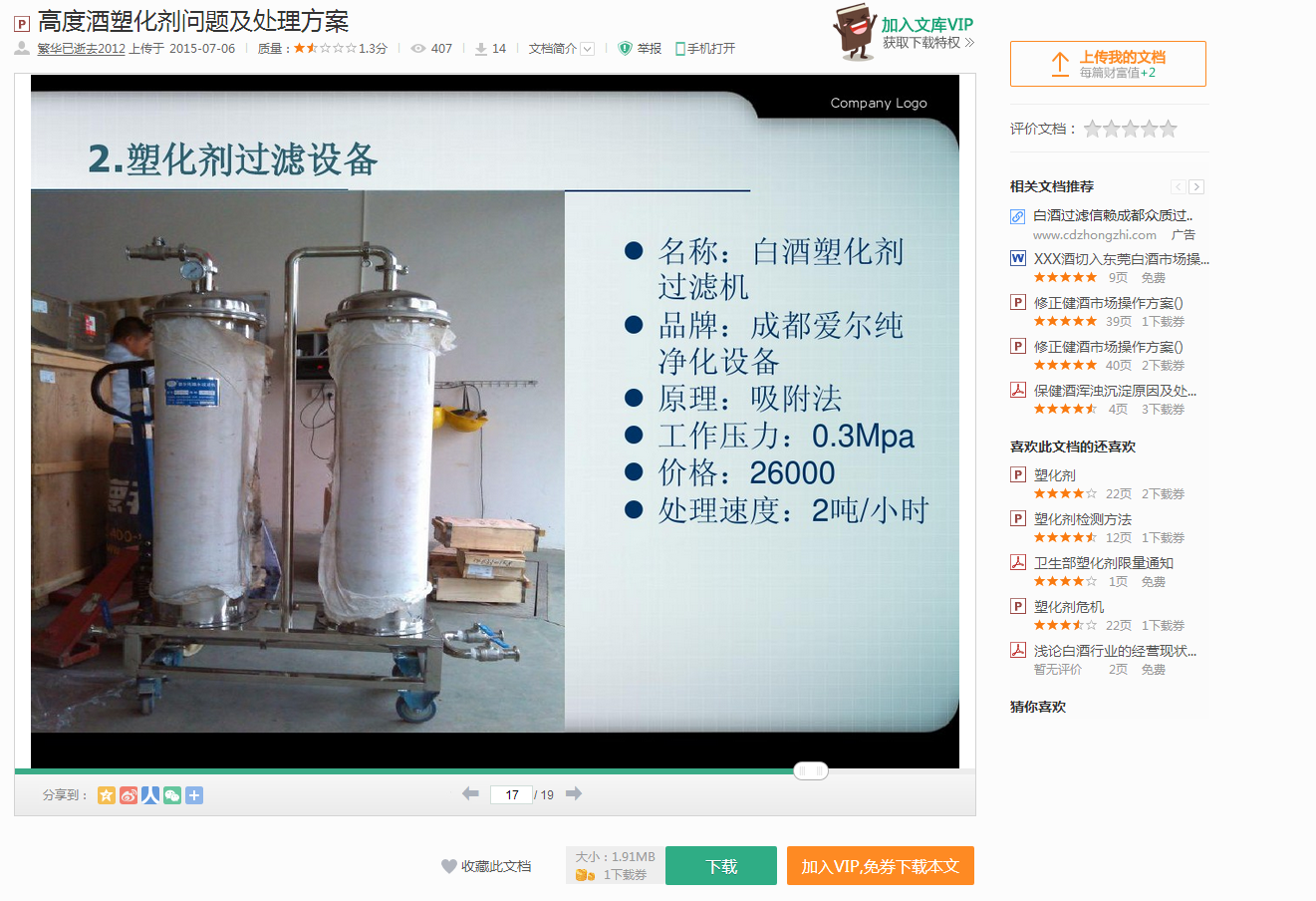 百度文庫,收錄我公司專利產品塑化劑過濾設備為白酒塑化劑處理的最佳解決方案